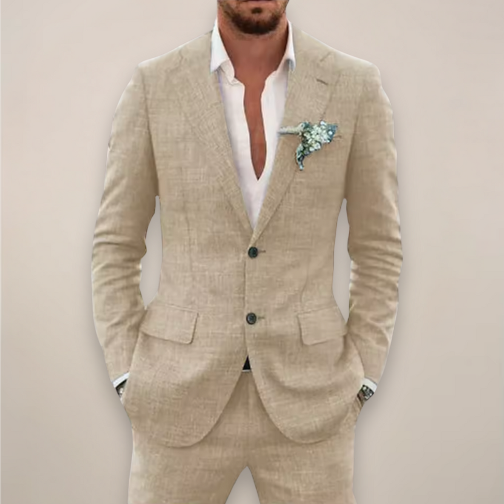 Adoptez le costume Raphaël la pièce idéale pour conjuguer élégance, confort et sophistication lors de mariages ou dîners en plein air.